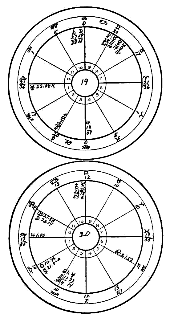 Horoscope No. 19 shows another case of heart disease. The Sun and Neptune are conjunct in the Eighth House, in opposition to Mars. As this conjunction is in the sign Gemini and in the house of death, it is easy to see the portent. The dynamic energy of Mars tears everything to pieces, accelerates motion, causes palpitation etc. The Sun and Neptune in Gemini shows a likelihood of a hemorrhage of the lungs, resulting from over activity of the heart. The Moon and Saturn in Leo show the obstructed passage of the blood, for the keynote of Saturn is obstruction and retardation: thus the valves of the heart become leaky and the backward flow of the blood called regurgitation takes place.