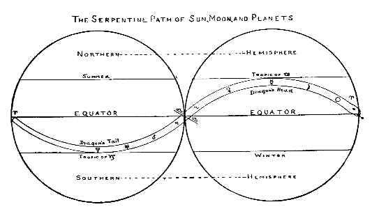 The Moon's nodes are tabulated in our Simplified Scientific Ephemeris, the position being given for every day; their places at birth are found by simple proportion, and the diagram herewith will explain that these points are called the "Dragon's Head" and the "Dragon's Tail" because the paths of Sun and planets appear serpentine when drawn upon a plane surface.