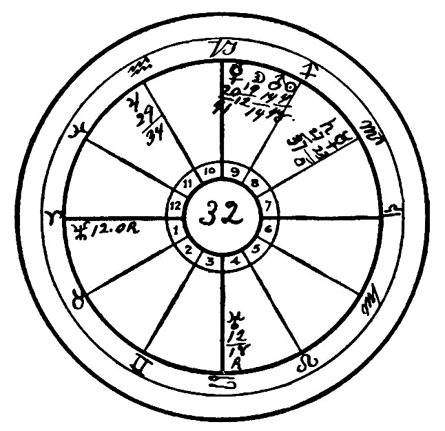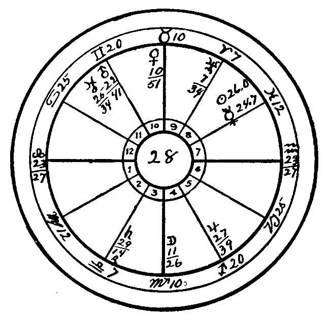 With respect to the mental qualities we find that Mercury is square to Uranus, and the Moon in opposition to Neptune. This makes her skeptical, critical, very peculiar and spasmodic in her mental processes, with an extremely morbid imagination. Uranus is placed in the Fifth House, governing courtship and the relations among the sexes prior to marriage, and therefore, squared to Mercury, it indicates an unconventional turn of the mind, with a tendency to promiscuous relations, involving public criticism and slander. That in itself is an extremely unfortunate configuration and condition in a life, but it is only one of a number of afflictions which point in the same direction, for in the Twelfth House, the house of sorrow, trouble, and self-undoing, we find Mars, the planet of dynamic energy, conjoined with Venus, the planet of love, in the fiery sign Aries, another inflammatory sex condition; and last, but not least, we note Neptune in Taurus, opposition to the Moon in Scorpio, which governs the generative organs. This latter is the worst of all for it makes the mind almost insane upon this subject, conjuring up before the imagination morbid pictures, and where the configuration occurs from the Sixth and Twelfth Houses it is a certain indication of inveterate self-abuse. Naturally such practices in time undermine the health and disease shows itself in the weakest parts of the body according to the indications of the horoscope. In the present case we find Saturn on the cusp of Gemini in conjunction with the Sun. Gemini is the sign which rules the lungs, and the conjunction as we see is almost exact, wanting only 26 minutes. Thus the cold, crystallizing saturnine forces are hardening the lungs and producing the disease we know as tuberculosis, which is slowly sapping her vitality and carrying her toward an early grave. It may be noted in passing that her mother succumbed to tuberculosis at the very moment when she gave birth to this child. Mars by progression has now arrived close to the place of Neptune at birth. This will unfortunately in all probability accentuate the morbid craving indicated by Neptune opposition to the Moon, so that if left to herself the end will not be very far off.