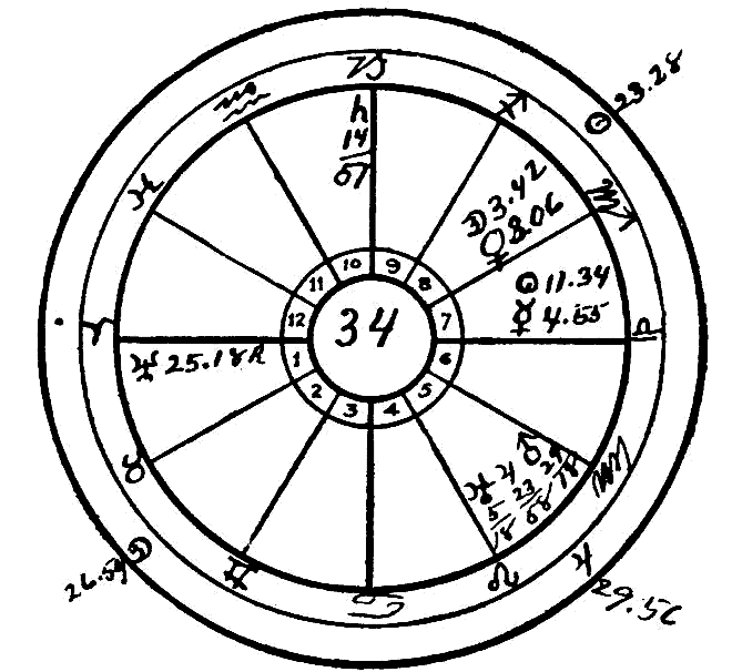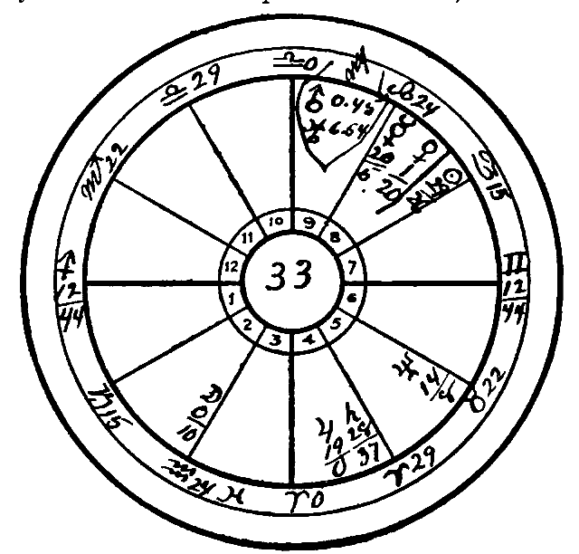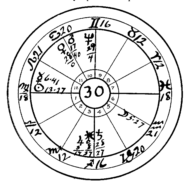 In 1913 the Sun progressed to the conjunction of Uranus and Mars. The aspects of the Sun are always effective for three years, one and one-half years before the aspect is exact, and a like period after. Therefore it was still active in 1914, when the Moon progressed to the conjunction of Saturn and thus enlivened this square to the Sun, Moon and Venus. Neptune, the watery planet, also reached the natal Sun by transit, and the poor soul was released by the total obstruction of the liquids; in other words, the dropsical condition stopped the heart.
